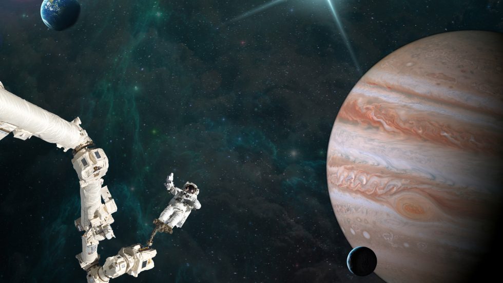 一名宇航员在太空中进行舱外活动,背景是浩瀚星空、地球和巨大木星,画面充满科幻感。