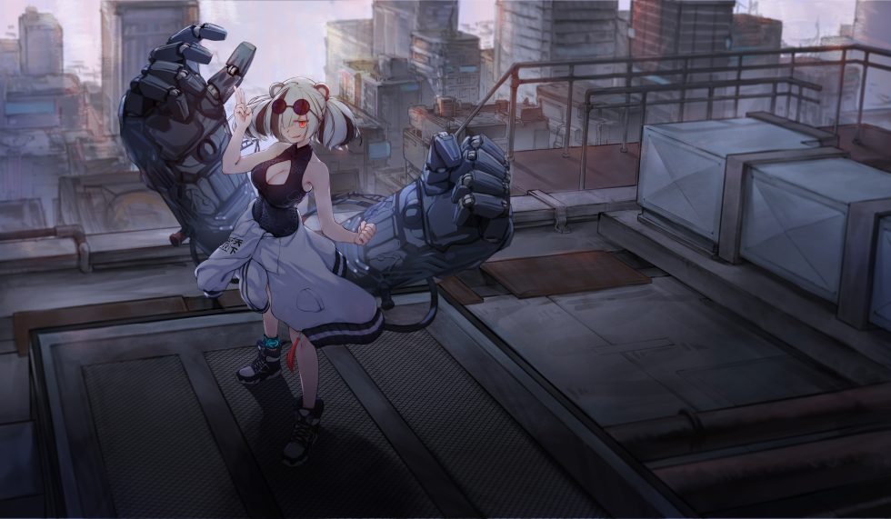 金发双马尾少女戴红镜,身着黑灰服饰,在高楼屋顶与巨型机械臂互动,背景是朦胧的赛博朋克城市。
