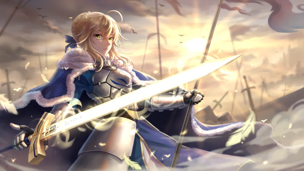 一位金发绿眼的女骑士身披蓝白毛领斗篷,手持发光长剑,背景是夕阳下的战场与飘扬旗帜。