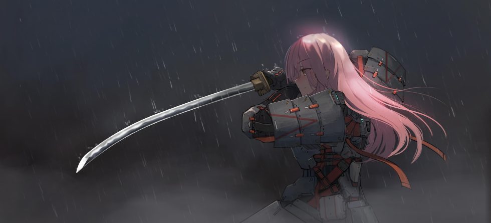 一位粉发少女在雨夜中手持长刀,身着机械装甲,长发随风飘扬,氛围冷峻而充满战斗感。