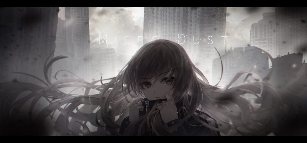 一位长发少女身处灰蒙城市废墟中,背景飘着微尘,氛围忧郁而神秘,画面色调偏黑白灰。