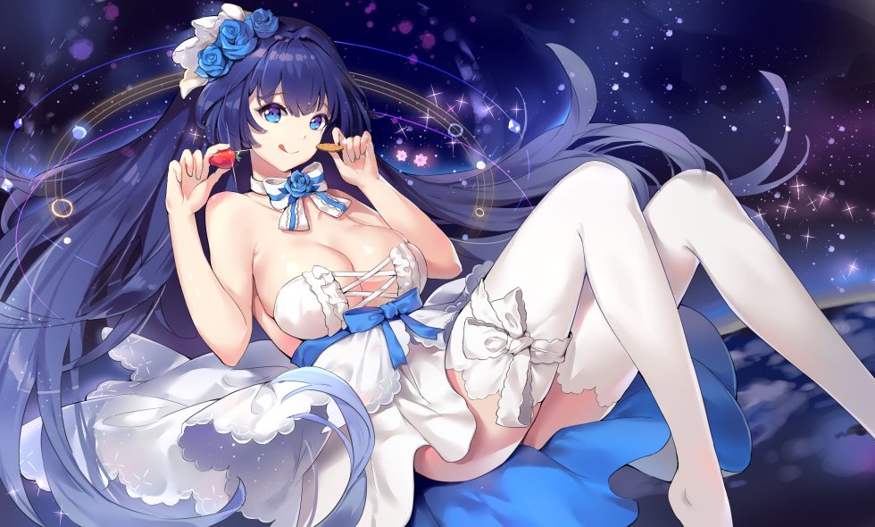 蓝发少女身着白蓝相间的女仆装,头戴花饰,手持甜点,在星光璀璨的宇宙背景中惬意躺卧。