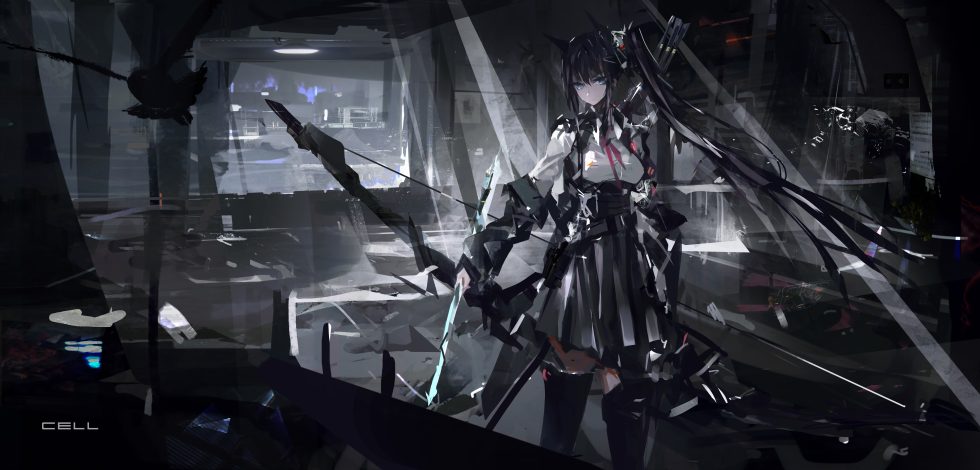 黑发少女身着黑白战斗装束,手持发光武器,站立在充满破碎玻璃与金属残骸的科幻废墟中,氛围冷峻而紧张。