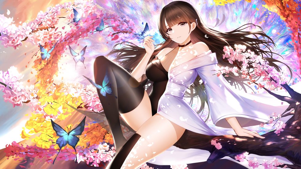 一位长发少女身着淡紫色和服与黑色丝袜,坐在绚烂的樱花树下,周围飞舞着蓝色蝴蝶,背景色彩梦幻绚丽。