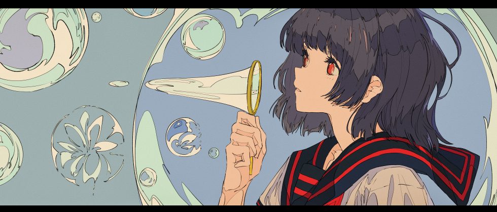 壁纸分类:8K壁纸 壁纸尺寸:9838×4205 像素 壁纸体积:18M 发布日期:2026年4月16日 一位黑发红瞳的少女手持金色边框放大镜,凝视着漂浮在蓝绿色背景中的奇异泡泡与花纹,画面充满梦幻与探索感。